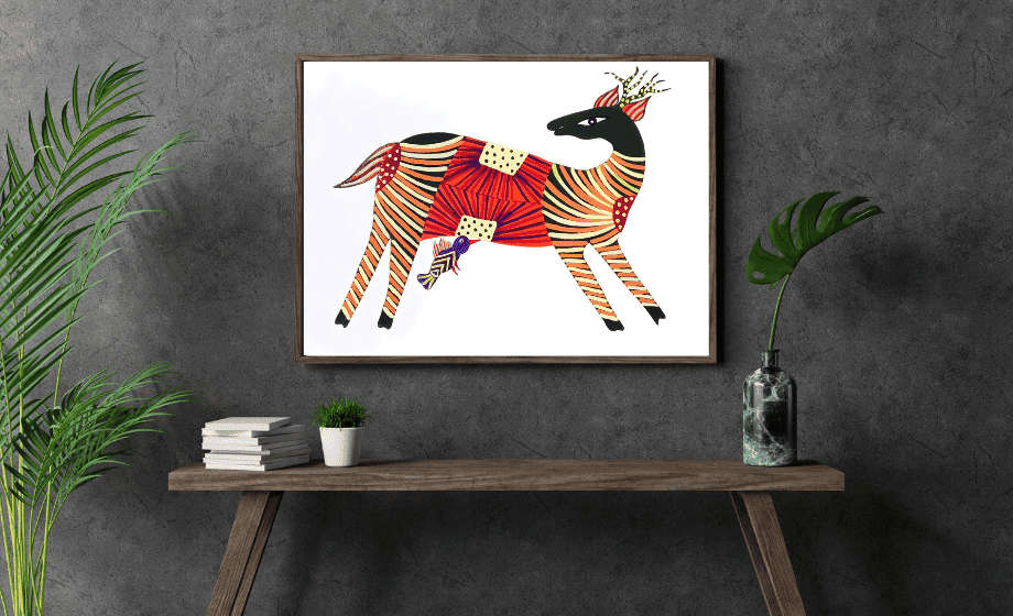 Deer Gond Art Painting, Handmade Tribal Colourful Deer Wall Art (11.6×8.2 Inches)