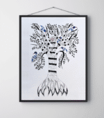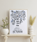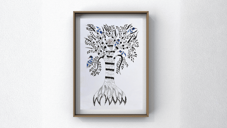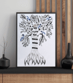 Bird with Egg is a graceful representation of traditional Gond tribal art that celebrates life, nurturing, and the beauty of nature. Handcrafted using black Rotring pen with delicate multicolour accents on premium sheet paper, this artwork features a majestic tree filled with vibrant birds protecting a central nest of eggs — symbolizing care, continuity, and natural harmony.