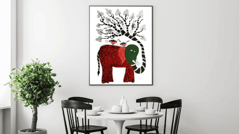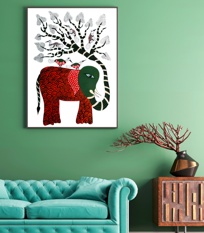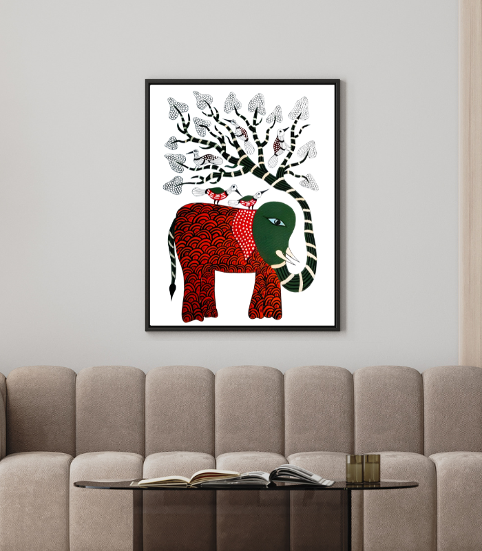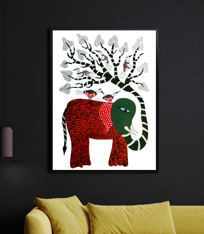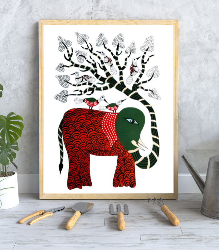 In tribal symbolism, the elephant represents wisdom, stability, and protection. The presence of birds and tree elements adds a storytelling dimension, reflecting harmony and coexistence in nature — a central theme in Gond art traditions.