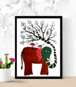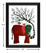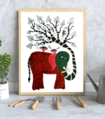 Elephant Gond Art is a powerful representation of traditional Gond tribal art that celebrates strength, wisdom, and the deep bond between animals and nature. Handcrafted using Rotring pen with rich natural colours on premium sheet paper, this artwork features a beautifully patterned elephant standing beneath a stylized tree filled with birds.