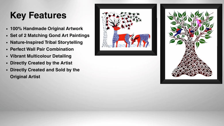The intricate patterns, fine line detailing, and rhythmic designs showcase the authenticity of Gond art, making this combo set both decorative and culturally rich.