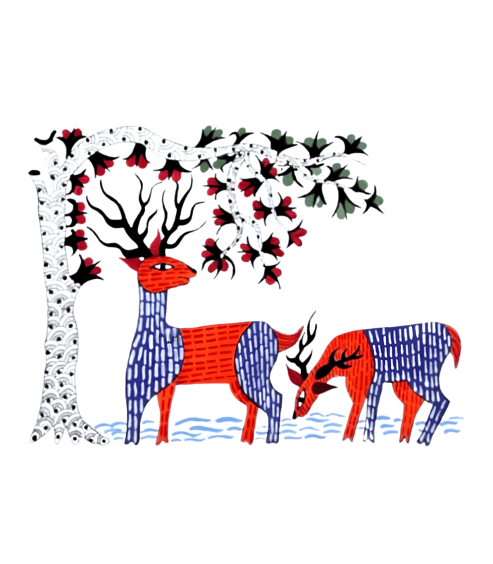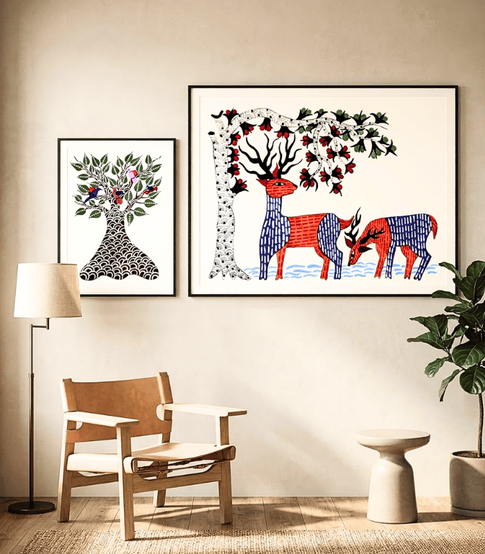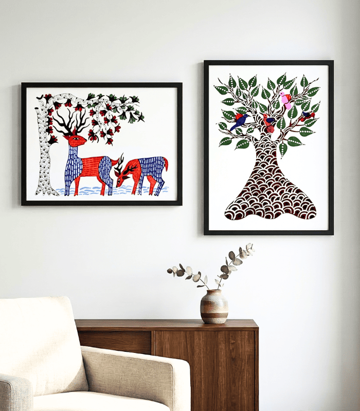 This Gond Art Combo Set brings together two beautiful handmade tribal artworks — “Deer and Tree” and “Tree with Birds”, both inspired by nature and traditional Gond storytelling.