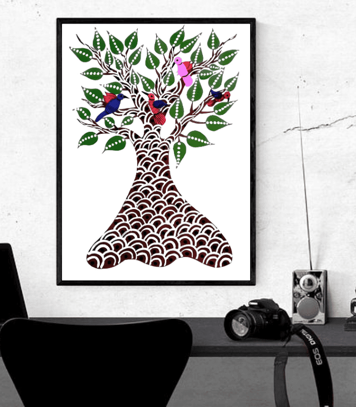 Created using black Rotring pen with vibrant natural colours on sheet paper, these artworks reflect harmony between animals, birds, and trees — a central theme in Gond tribal art.