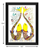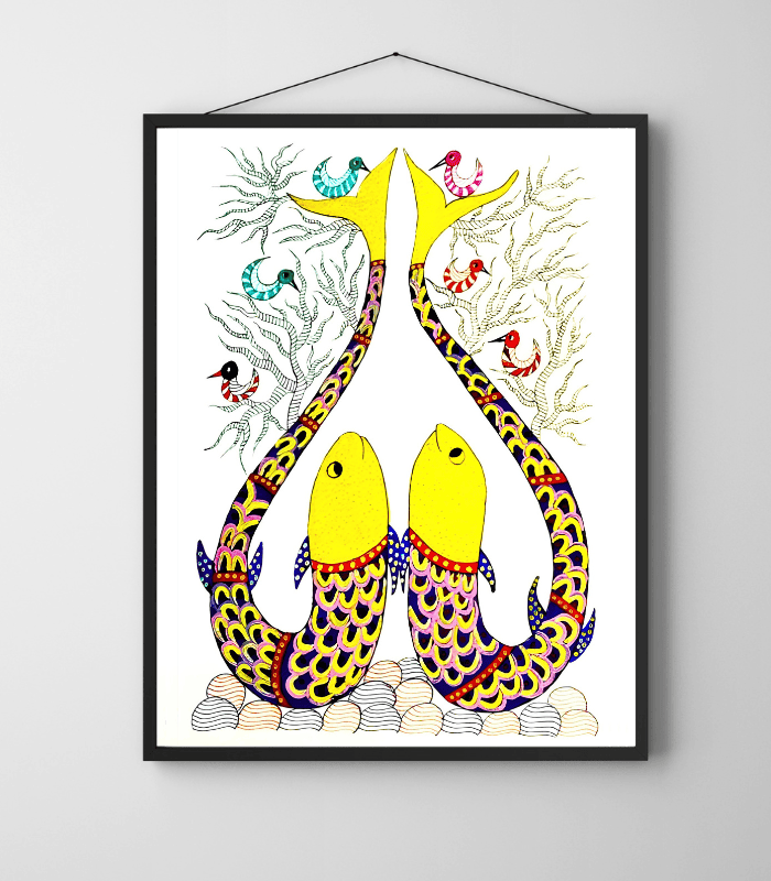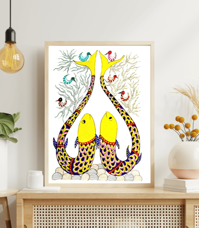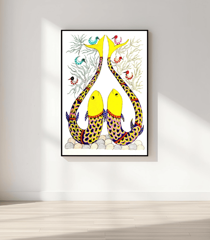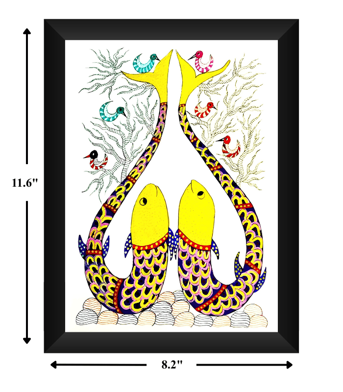Gond Fish Art is a vibrant expression of traditional Gond tribal art that celebrates life, abundance, and natural harmony. Handcrafted using Rotring pen with rich natural colours on premium sheet paper, this artwork features two beautifully patterned fish surrounded by decorative aquatic elements and stylized trees.