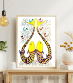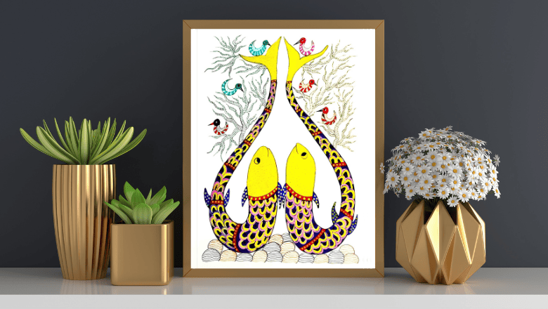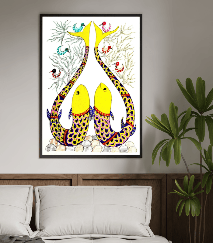In tribal symbolism, fish represent prosperity, fertility, and flow of life, making this artwork both meaningful and visually striking. The bright yellow tones combined with intricate multicolour patterns create a lively composition that reflects the rhythmic storytelling style of Gond art.