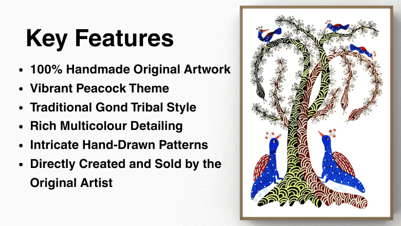 Each piece is carefully hand-drawn and coloured by the original artist, ensuring originality and authenticity. This is not a print — it is a 100% handmade Gond artwork created with cultural passion and artistic dedication.