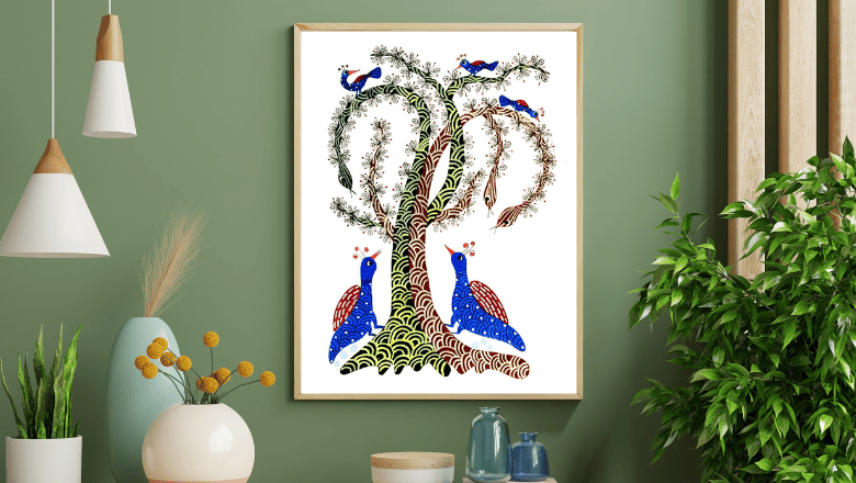 In tribal symbolism, the peacock represents beauty, pride, and joy, while the tree symbolizes life, growth, and interconnectedness. The intricate hand-drawn patterns and colourful detailing create a lively and rhythmic composition that reflects the authentic spirit of Gond art.