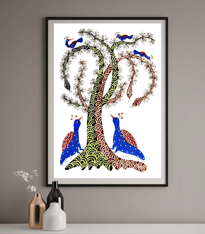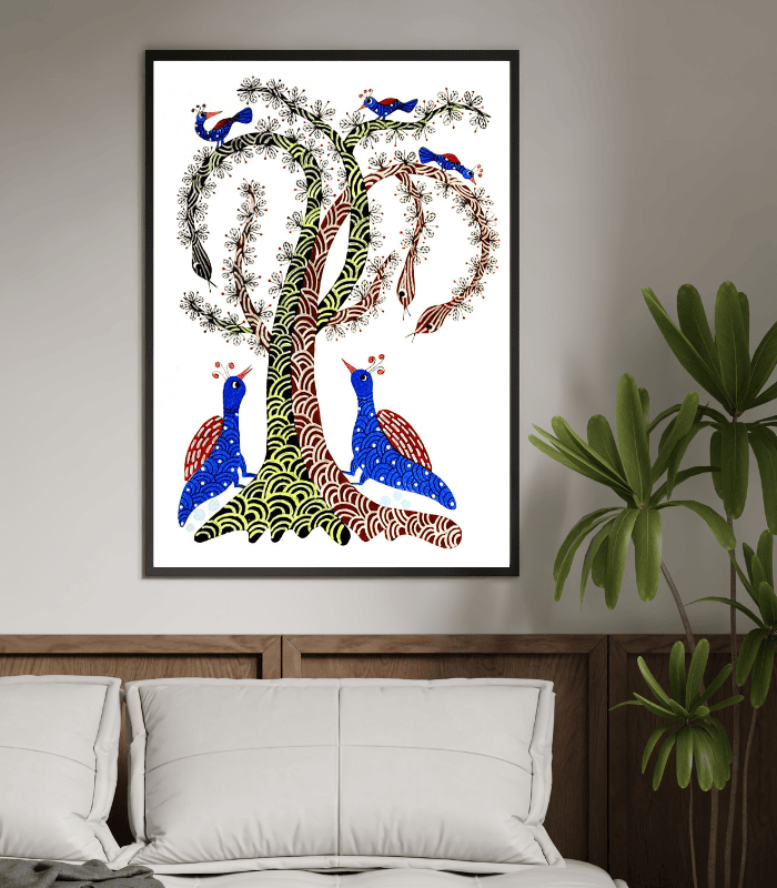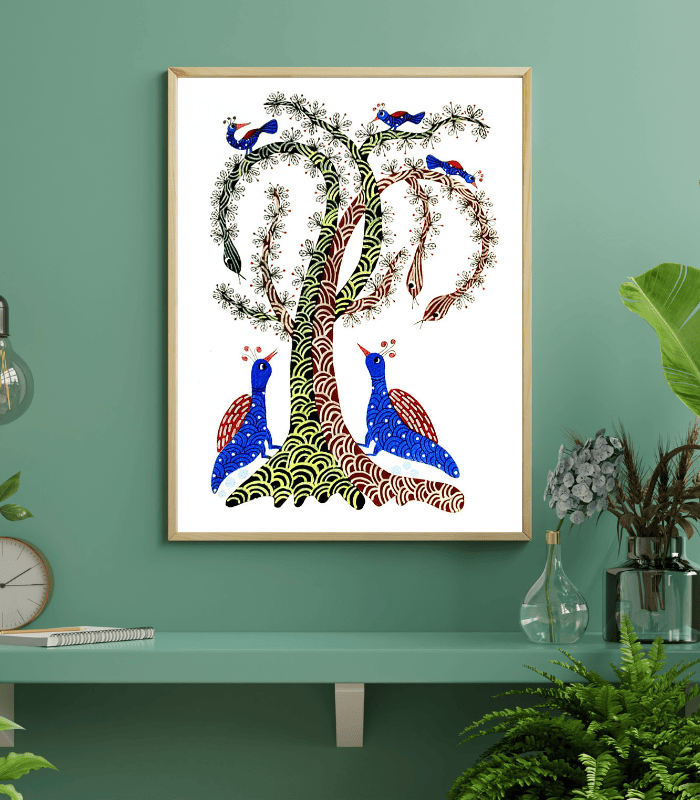Gond Peacock with Tree Art is a beautiful expression of traditional Gond tribal art that celebrates nature, life, and vibrant storytelling. Handcrafted using Rotring pen with natural multicolours on premium sheet paper, this artwork features elegant peacocks resting beneath a richly patterned tree filled with organic tribal motifs.