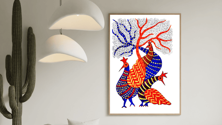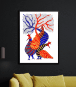 The detailed hand-drawn patterns and bright natural colours highlight the authentic storytelling style of Gond art — one of India’s most celebrated tribal art forms known for its symbolic motifs and rhythmic design language.