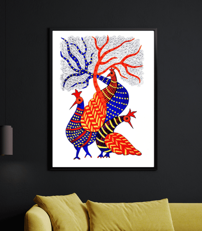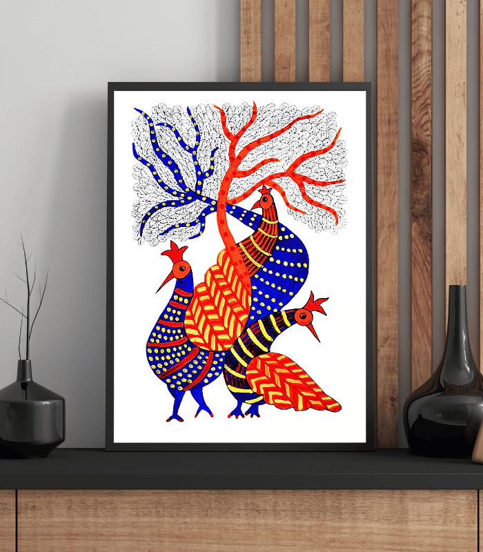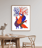 In tribal symbolism, the peacock represents grace, pride, and beauty, while the tree symbolizes growth, life, and connection with nature. The bold contrast of blue and red tones combined with intricate tribal patterns makes this artwork visually powerful and culturally rich.