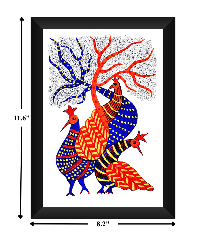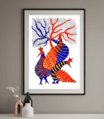 Peacock and Tree is a vibrant expression of traditional Gond tribal art that celebrates beauty, life, and the colourful harmony of nature. Handcrafted using Rotring pen with rich natural multicolours on premium sheet paper, this artwork features elegantly patterned peacocks standing beneath a stylized tree — creating a striking visual full of rhythm and movement.