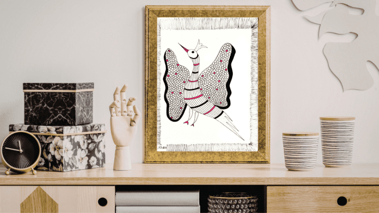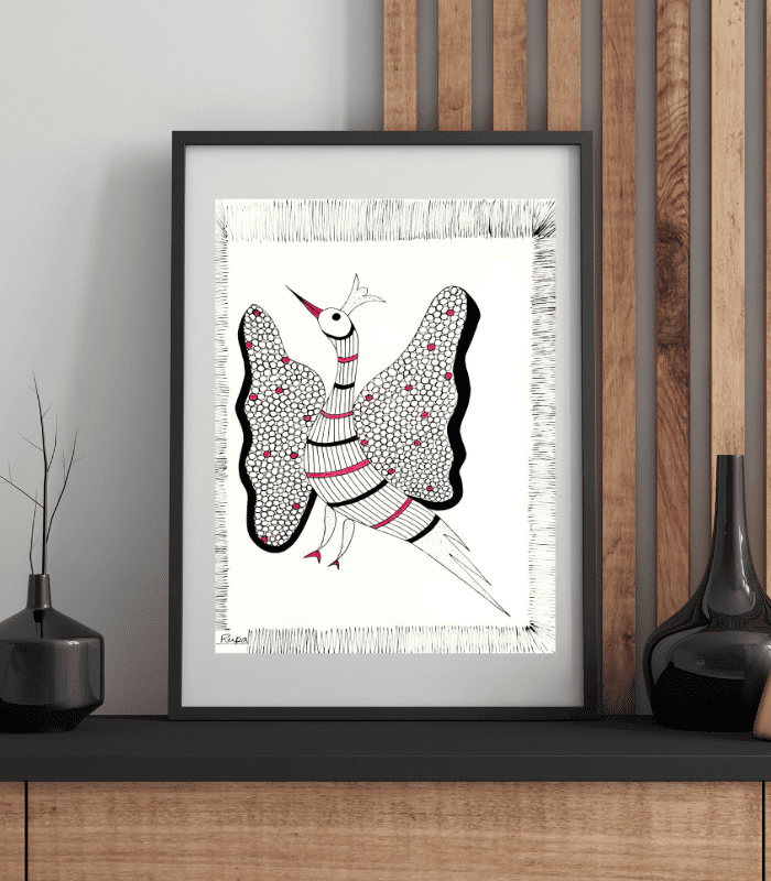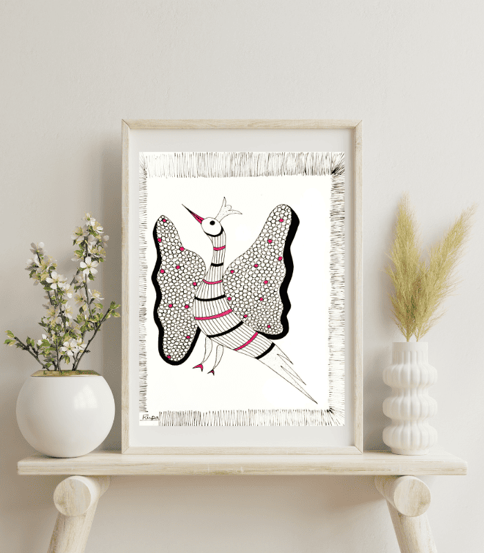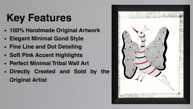 The rhythmic line work, fine dot patterns, and minimal colour accents reflect the authentic storytelling style of Gond art — a tribal art form deeply rooted in nature symbolism and handcrafted expression. The use of pink highlights adds a gentle modern touch while maintaining traditional artistic purity.