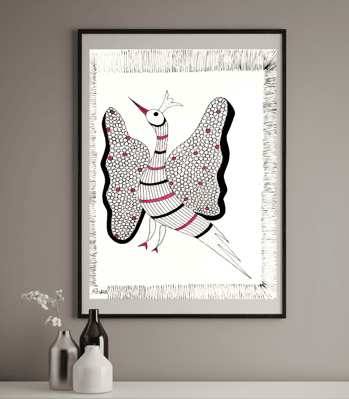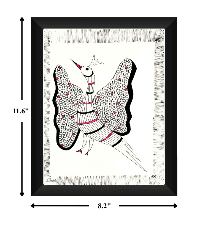 Buy handmade Peacock Gond Art created using black Rotring pen with pink accents. Authentic Indian tribal bird artwork perfect for home, office & ethnic decor.
